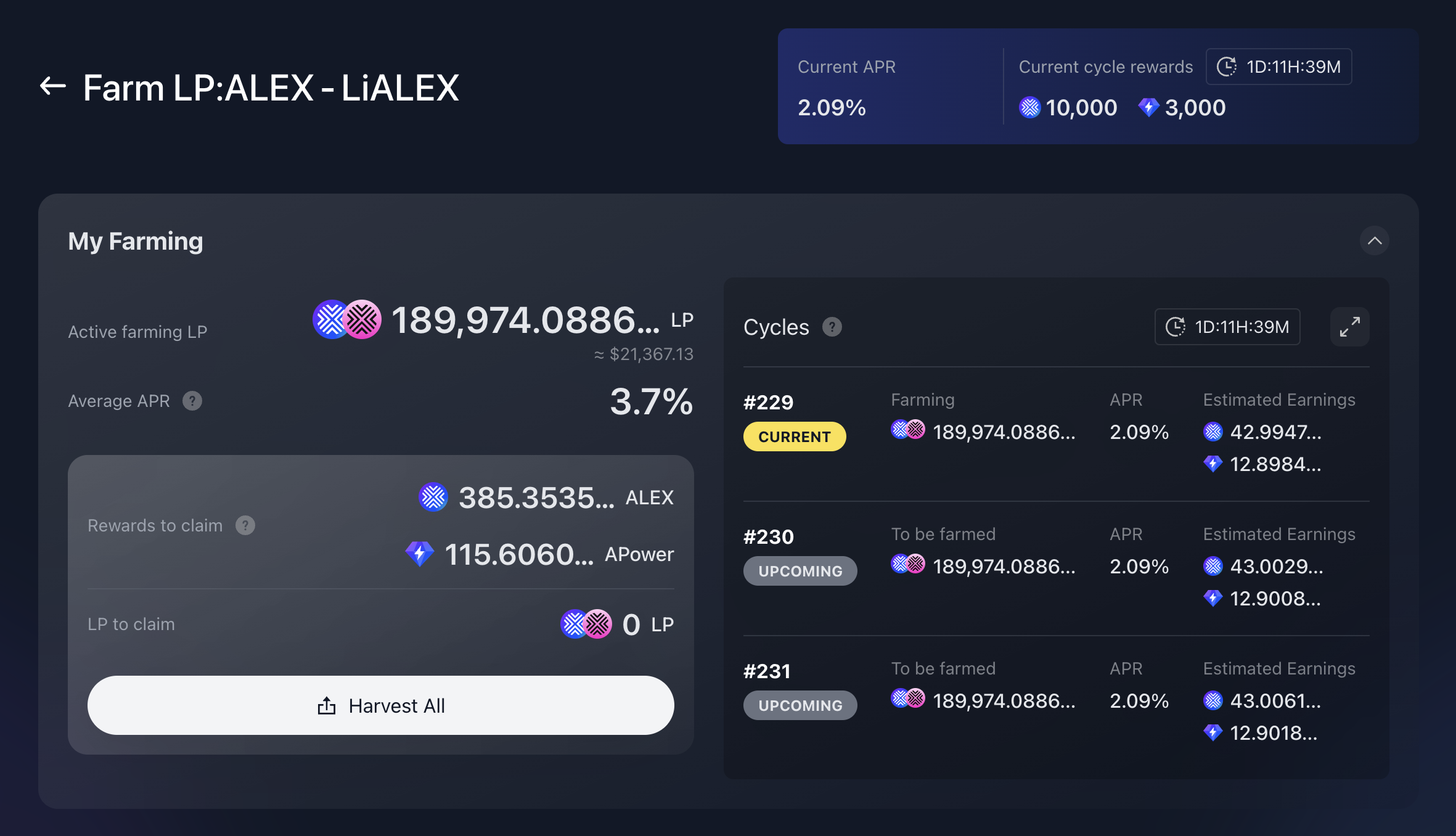 <figure><img src="https://959532270-files.gitbook.io/~/files/v0/b/gitbook-x-prod.appspot.com/o/spaces%2FcPba3T1TXTWQ8joiZkYd%2Fuploads%2Fgit-blob-3d0e2caaabc282680de59f0786681e2115f85cec%2Fmy-farming-dashboard-example.png?alt=media" alt=""><figcaption><p>My Farming dashboard example for ALEX - LiALEX farm. This user has accumulated rewards from previous cycles that are available to claim. Also, there are no LP tokens that have completed their staking period and are ready for withdrawal (LP to claim).</p></figcaption></figure>